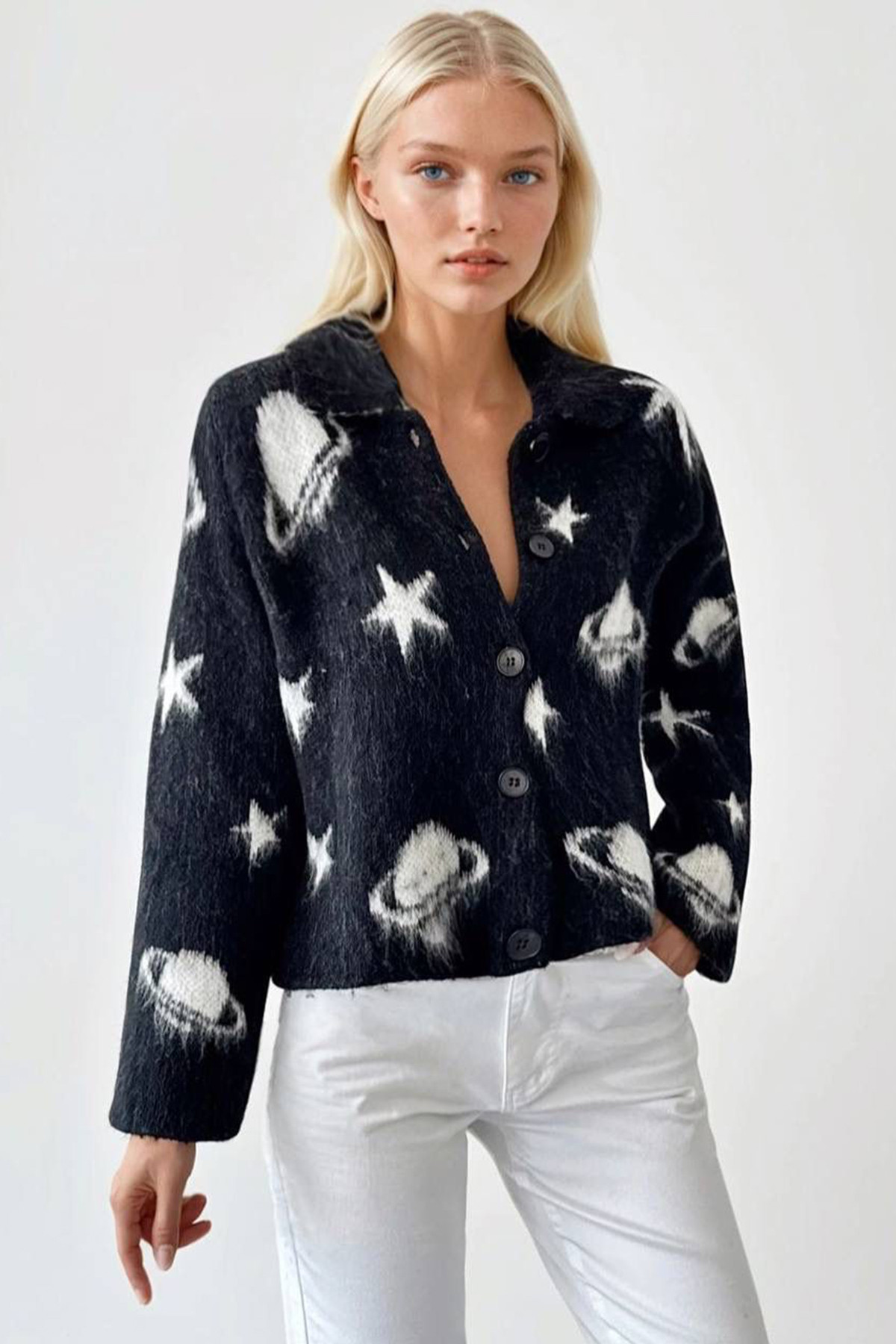 Siyah Beyaz Uzay Desenli Kadın Triko Hırka