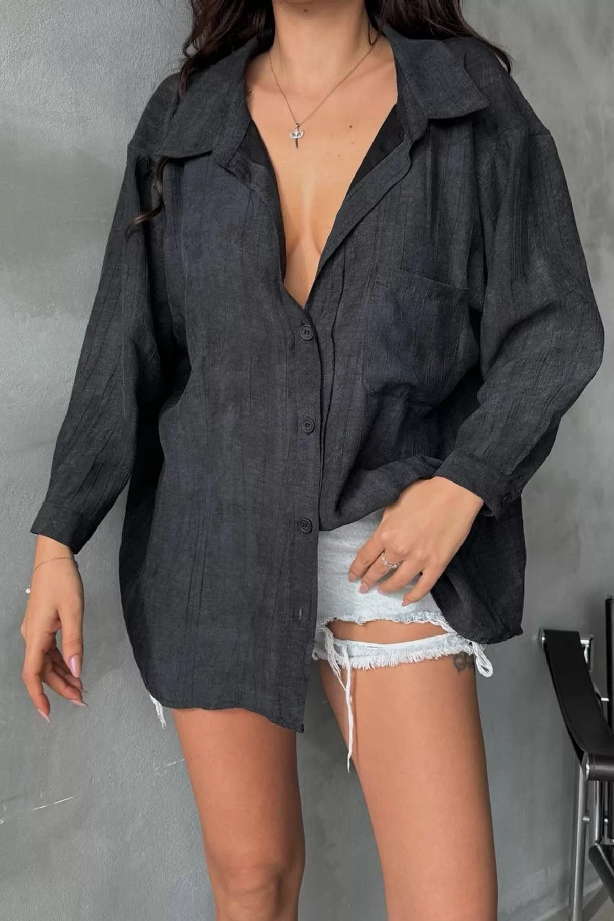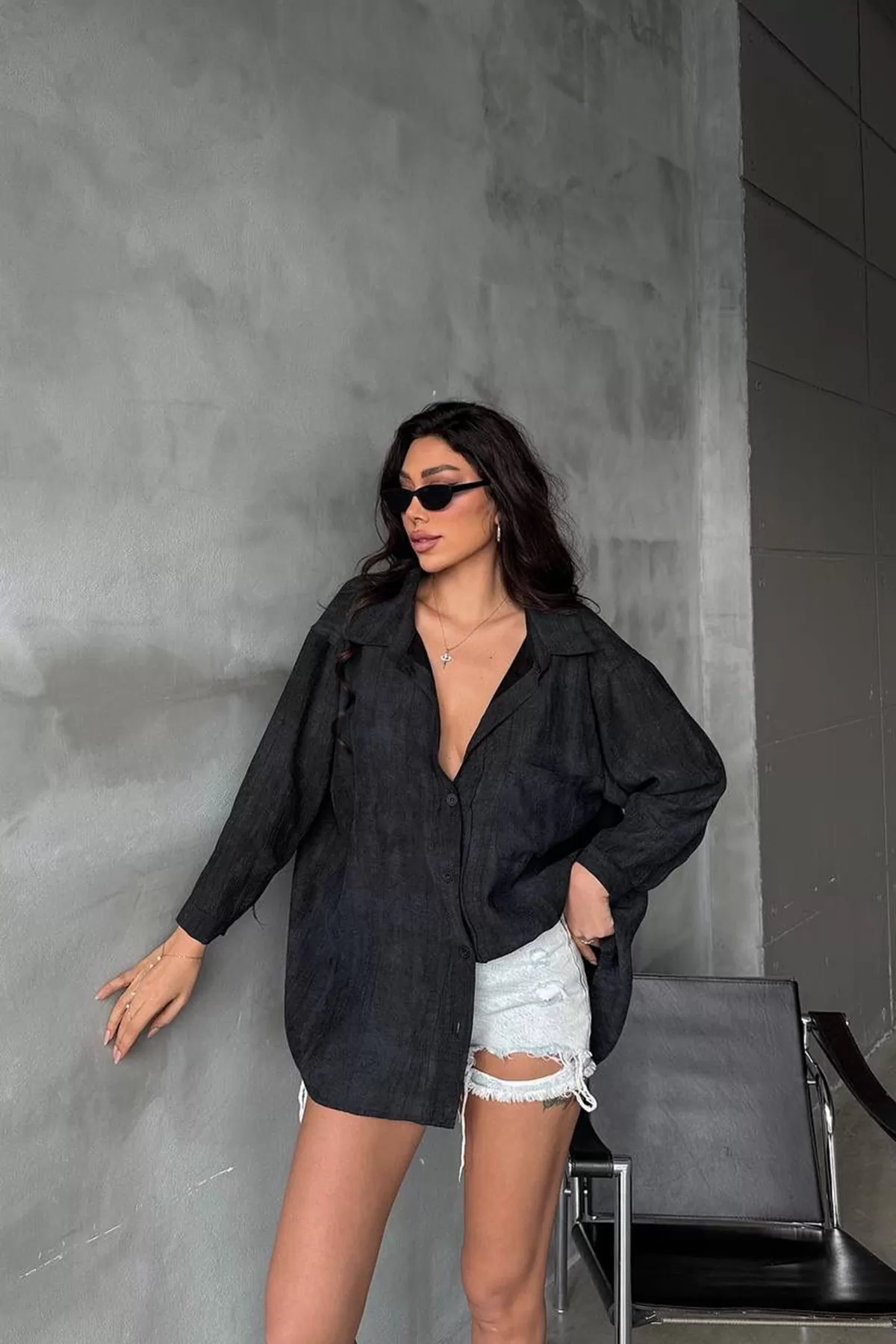 Yüzde yüz pamuklu kumaş Siyah Keten Kadın Gömlek