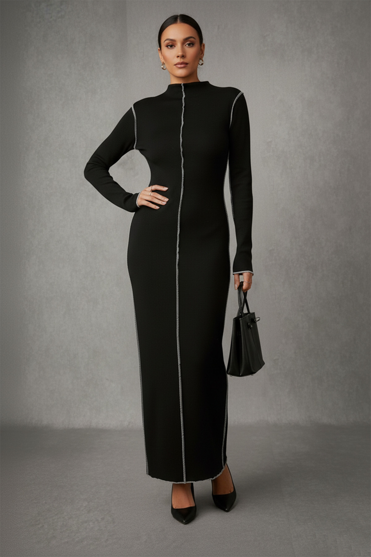 Yüzde yüz pamuklu kumaş Siyah Pamuklu Uzun Elbise