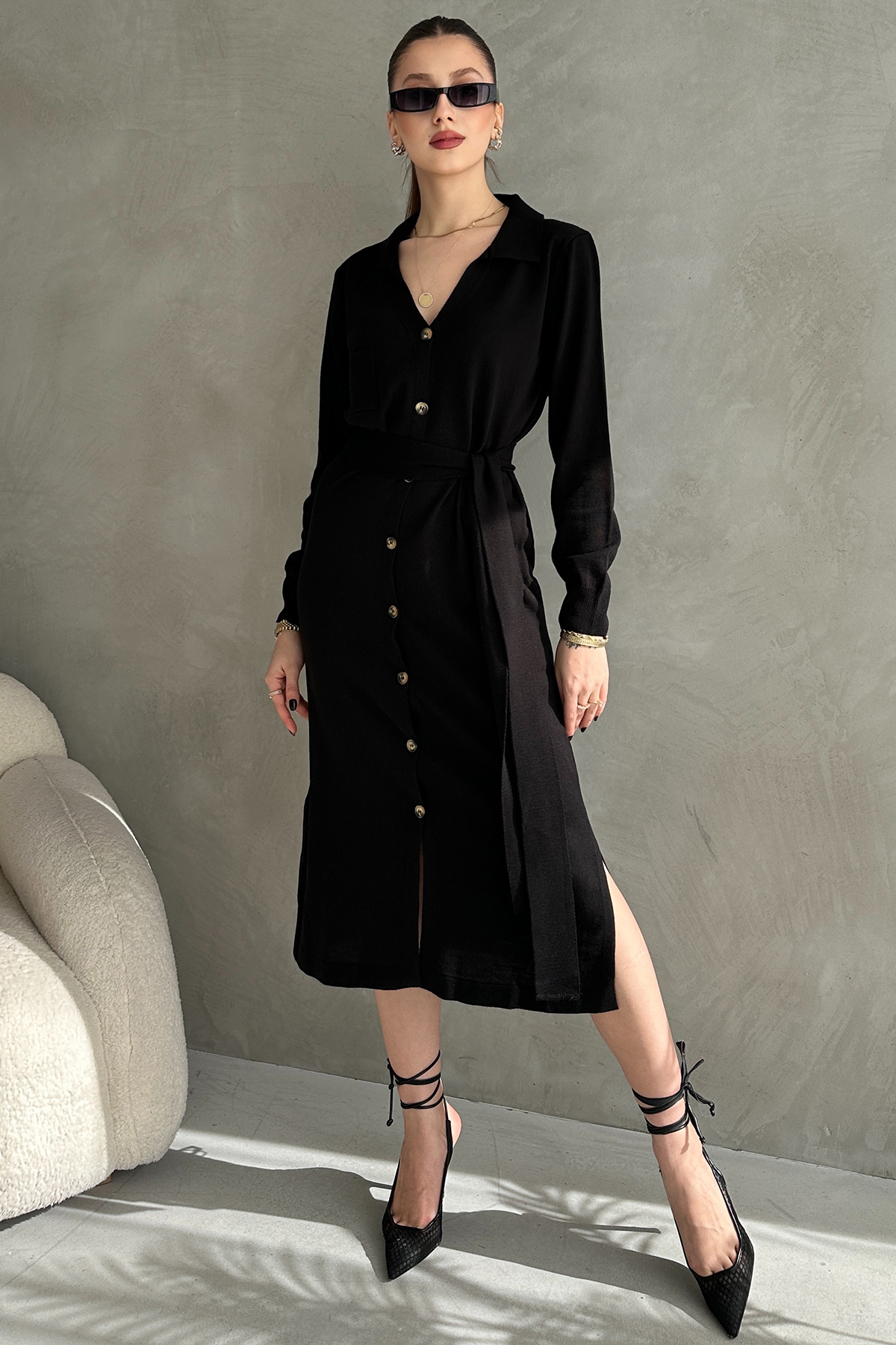 Siyah Triko Gömlek Yaka Midi Elbise
