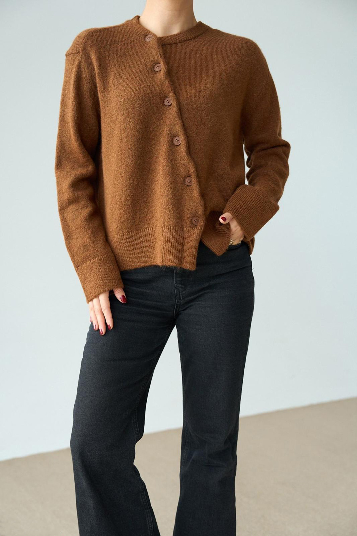Taba Yünlü Asimetrik Düğme Kapamalı Kadın Hırka