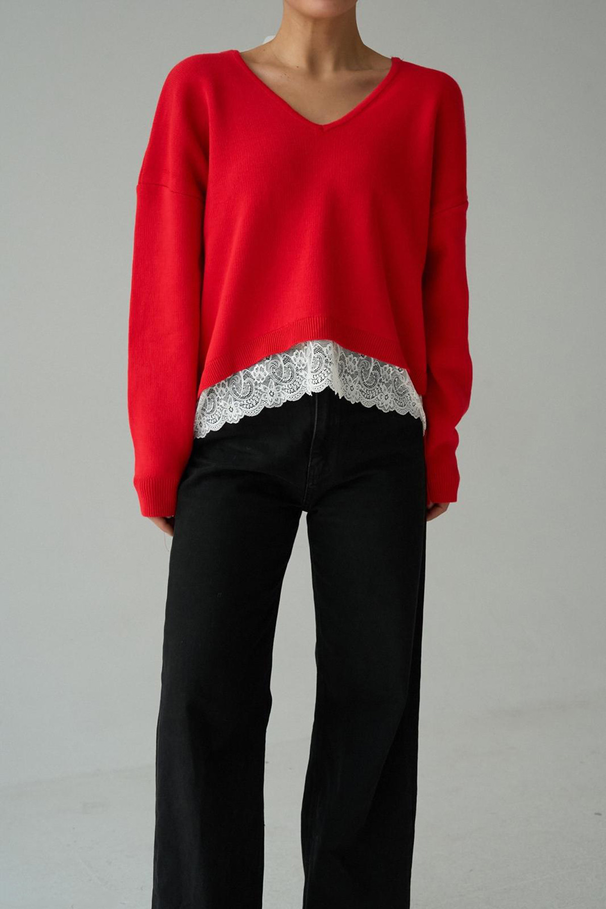 V Yaka Dantel Detaylı Kırmızı Triko Kadın Kazak