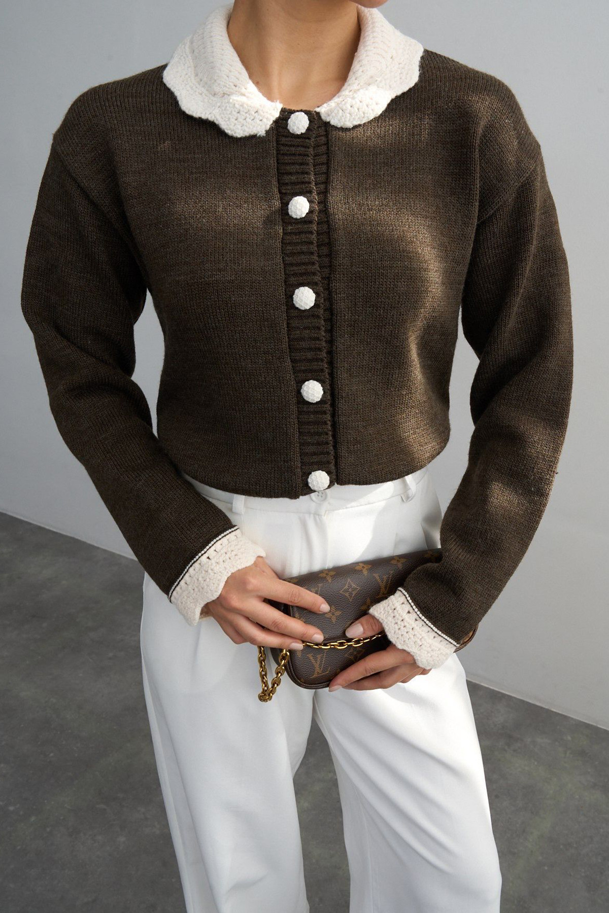 Yaka Detaylı Kahverengi Triko Kadın Hırka