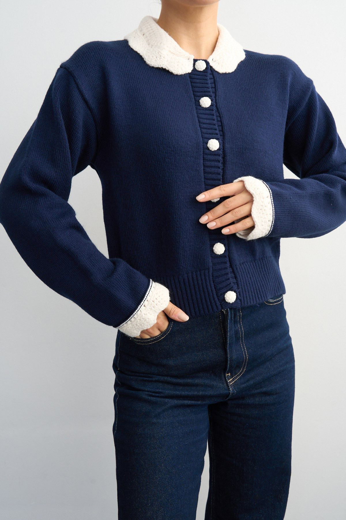 Yaka Detaylı Lacivert Triko Kadın Hırka