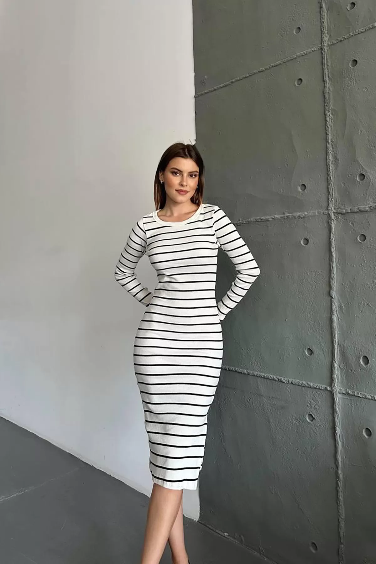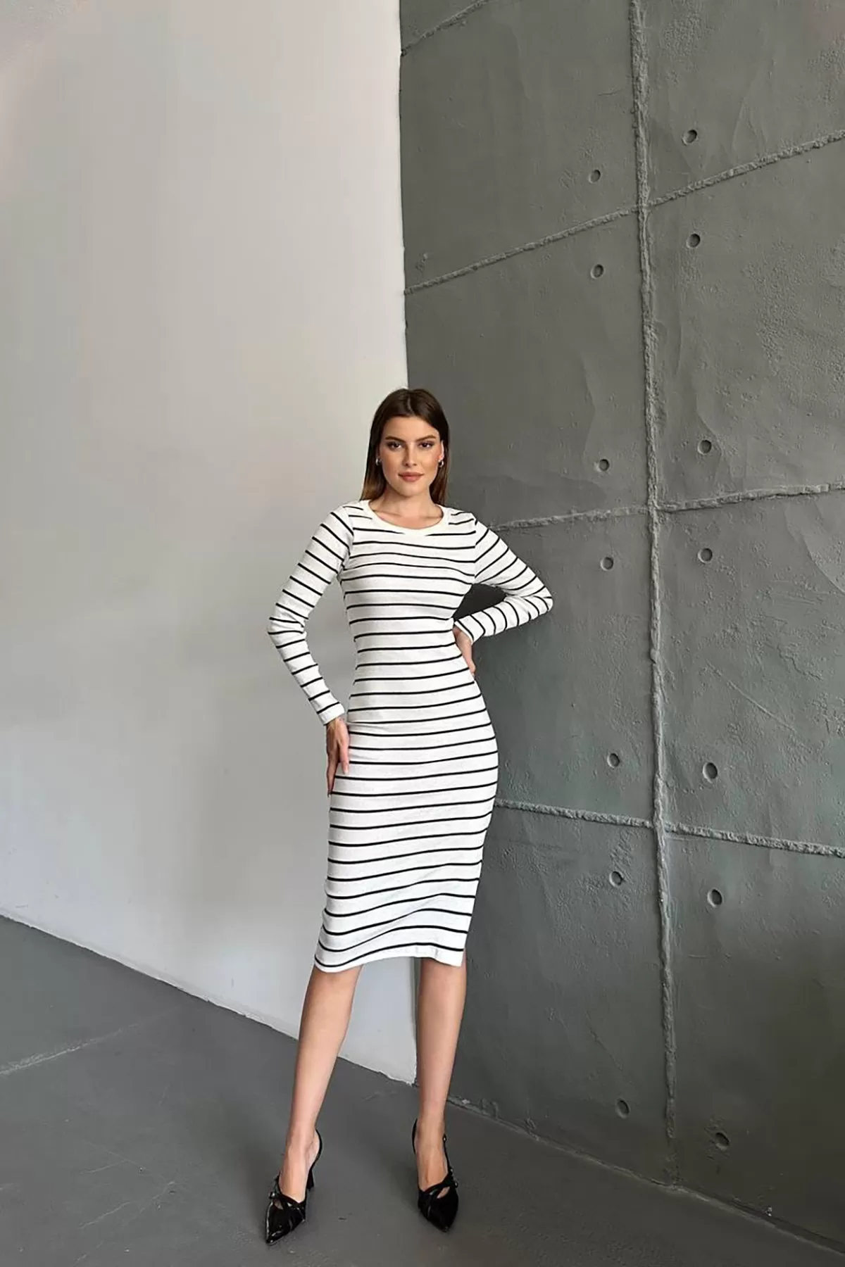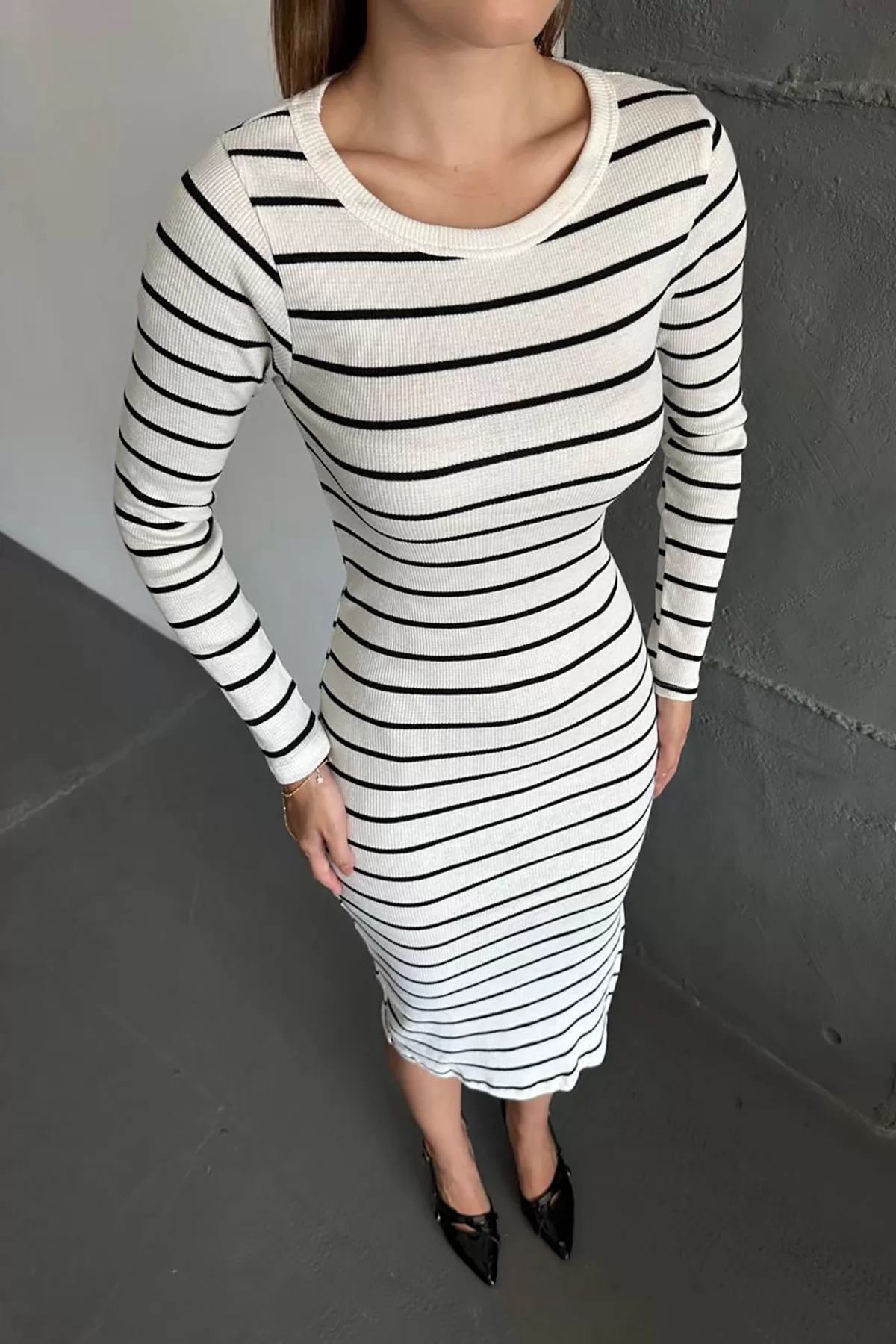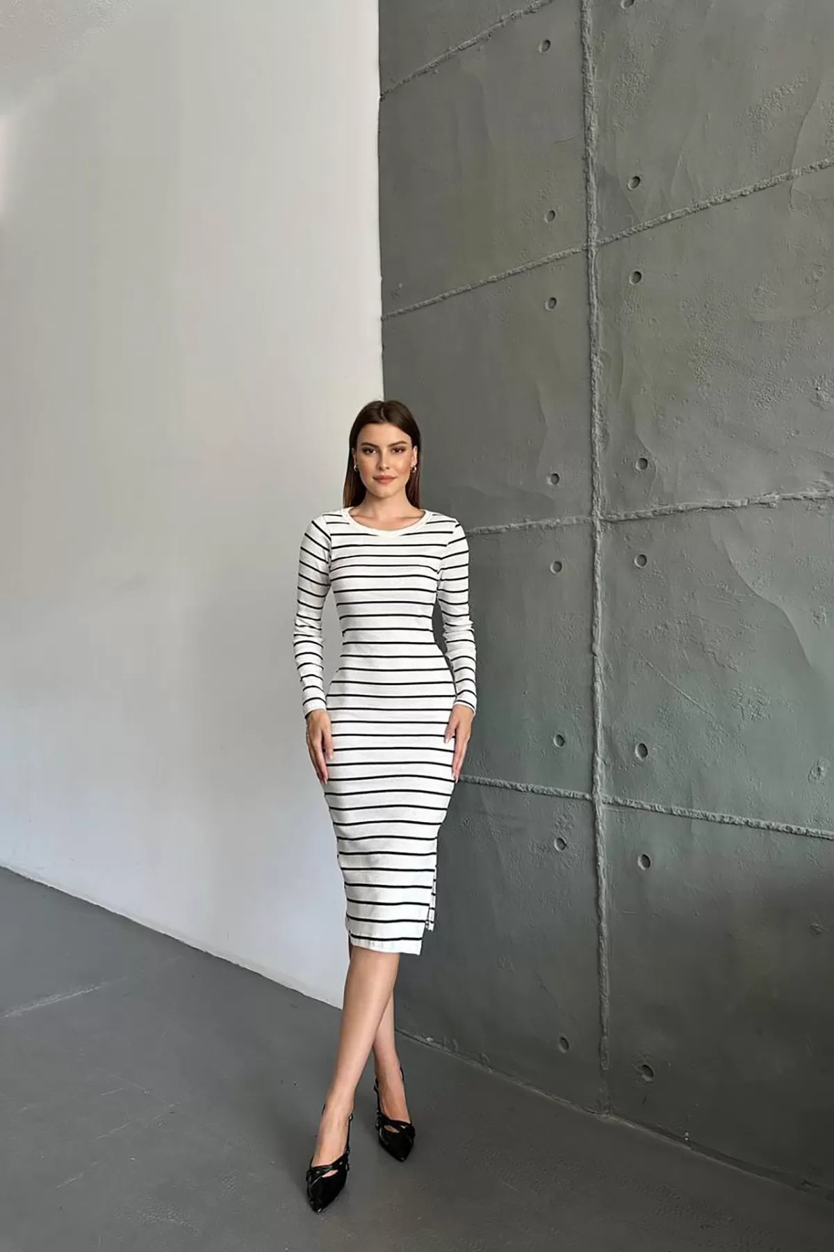 Yırtmaçlı Beyaz Siyah Çizgili Midi Elbise