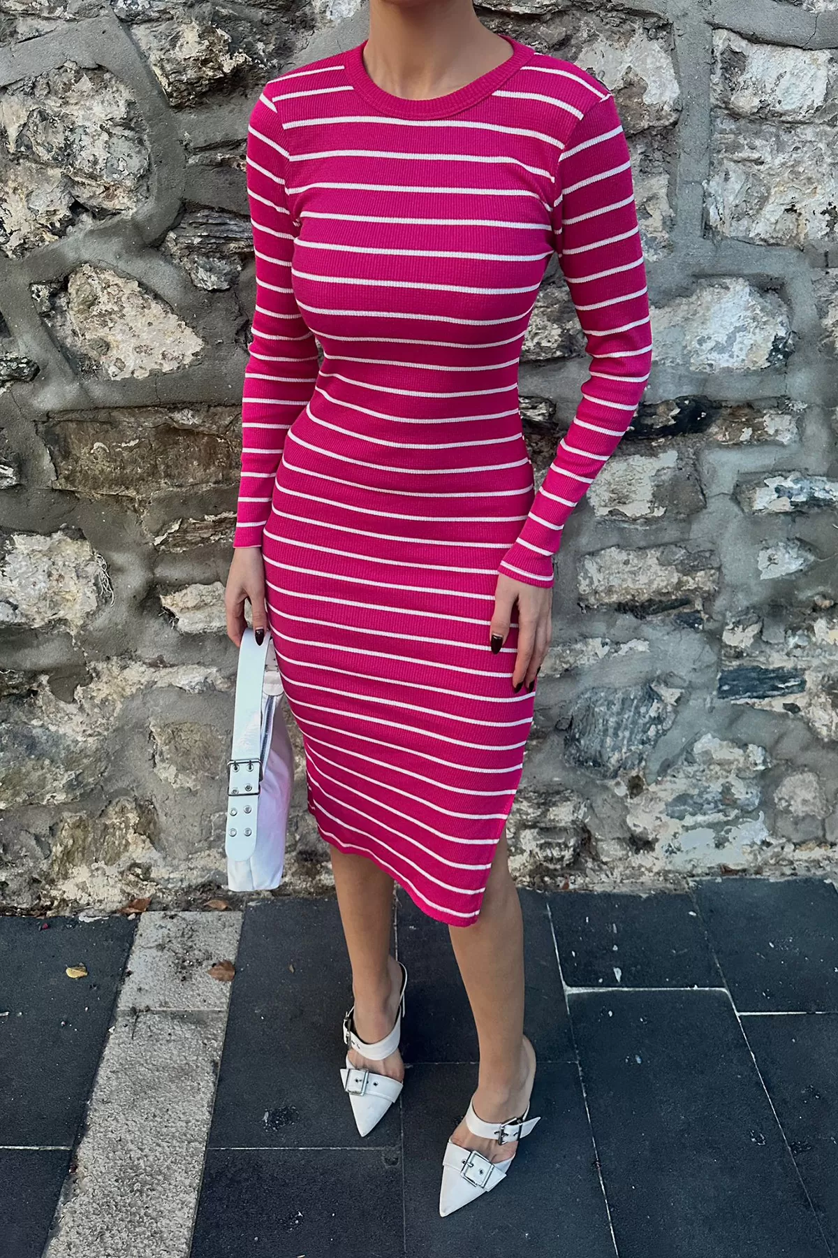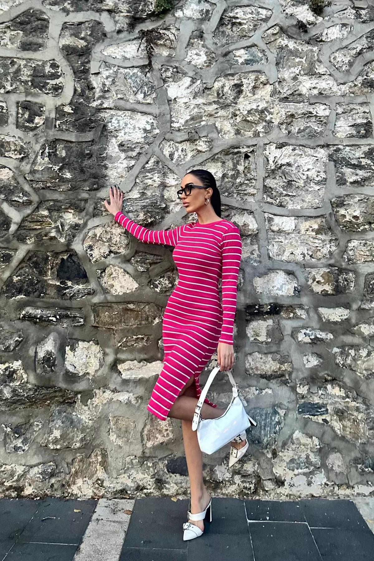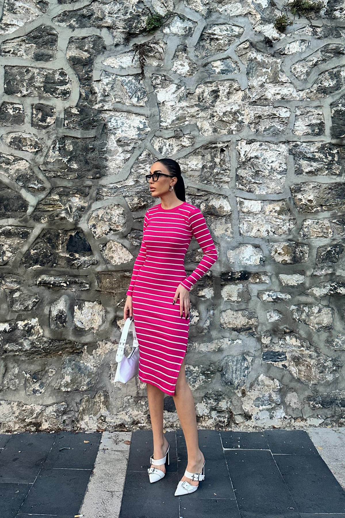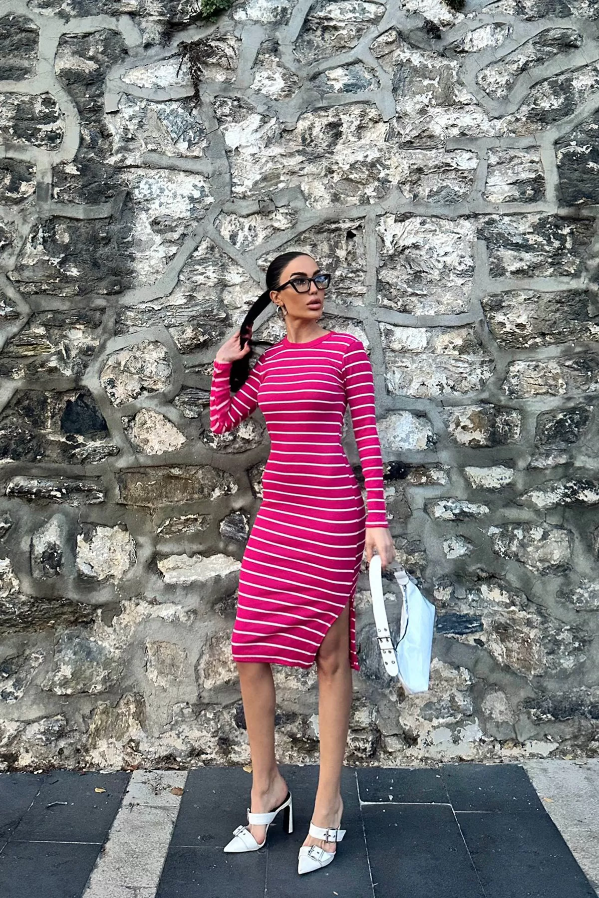 Facebook Pixel Yırtmaçlı Fuşya Beyaz Çizgili Pamuklu Midi Elbise, Fiyatı 129.47 TL | Nare Giyim